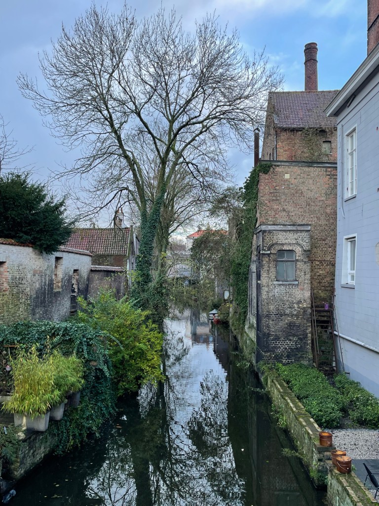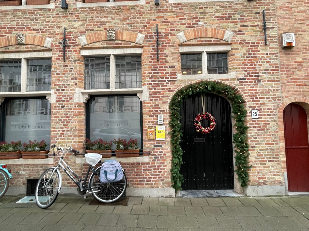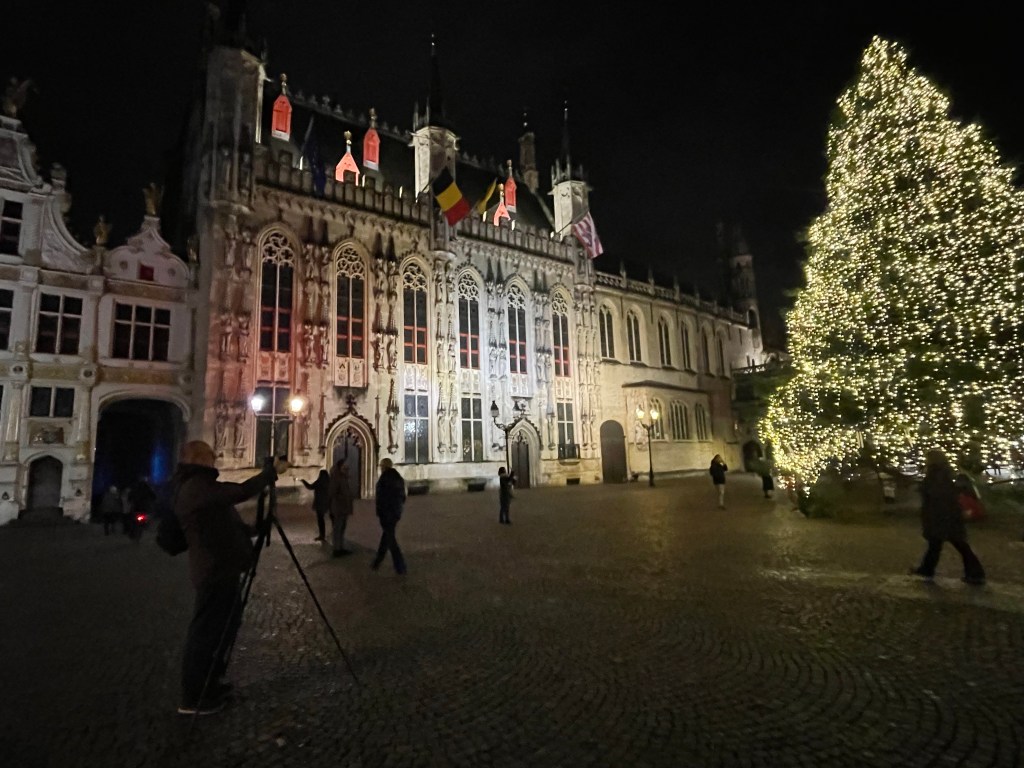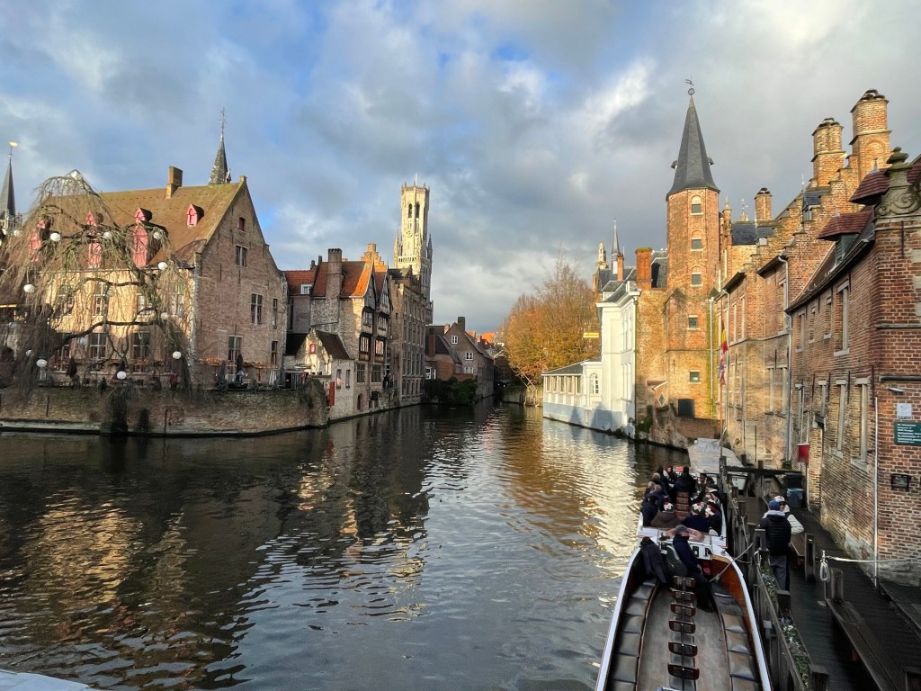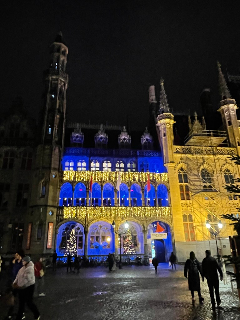 I had a great nights sleep and woke up ready for the day. No jet lag. We saw a lot of interesting things and did a canal boat ride in the afternoon to rest our feet. We stopped at a small, almost hidden bar that we learned about on our walking tour yesterday. They serve a beer there that you can’t buy anywhere else. It was packed and they were going to turn us away until a lovely woman from Portugal invited us to share a table with her and her sister. She comes to Belgium annually to visit family in Brussels and when she does she always comes to Bruges for this beer. It was her sister’s first trip there. They were delightful to spend time with and it was a real highlight of my day. When we left there was a long line of people waiting to be able to go in. When it came time to find a place for dinner we were having trouble finding something. We ended up at an Irish Pub, as one does when they are in Belgium. We were then going to go on a 3.5 kilometer walk afterwards to see a series of special light installations, but after already walking almost 24,000 steps and 10+ miles we decided against it. We had already seen a couple of them anyway. It was a good day!