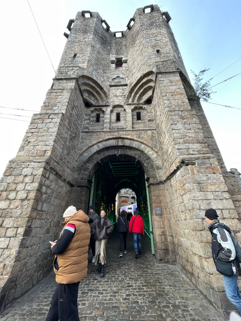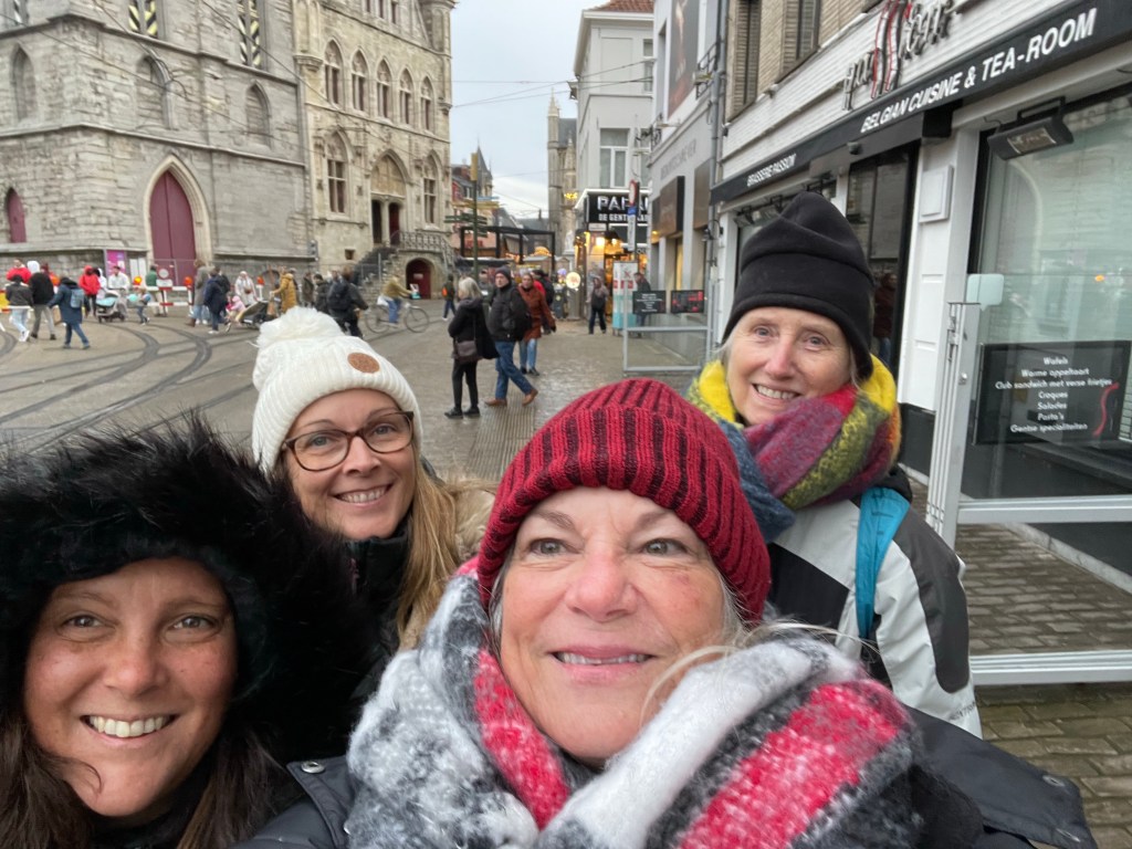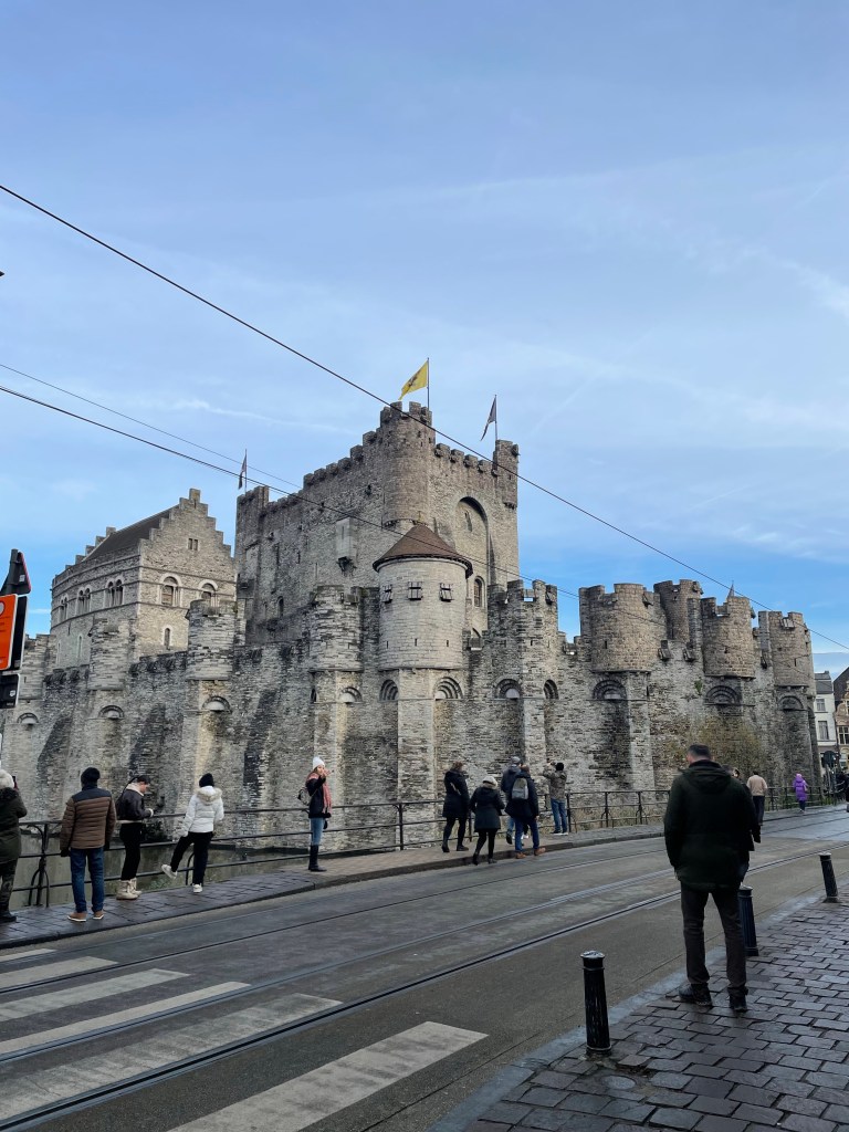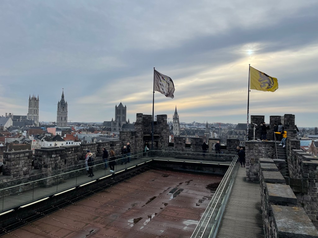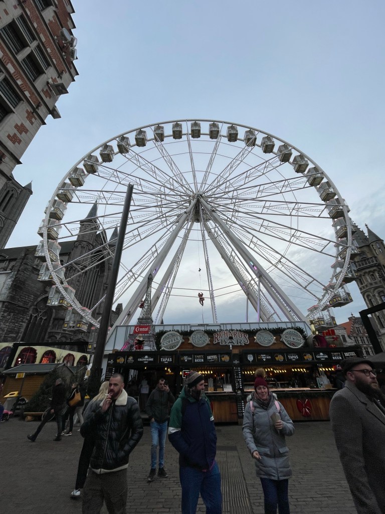 Thursday, December 7 we took the train to Ghent today. We went to the Castle of The Counts, which has a very interesting history. The narrator of the audio guide was really amusing and brought history to life with humor. We wandered around the City Center and checked out the Christmas Market, where I finally had a chance to get some Glühwein, a church and some other things. Marie and I both broke down and bought some warmer scarves. Think of a blanket wrapped around your neck and that’s what it is. As we were walking to the tram that would take us back to the train station we ran into the delightful women from Portugal that we met yesterday in Bruges. It’s a small world. I now have a connection in Lisbon for when we go to Portugal in a couple of years. We had a really nice dinner to wind up our stay in Bruges and almost beat the rain as we walked back to our B&B.