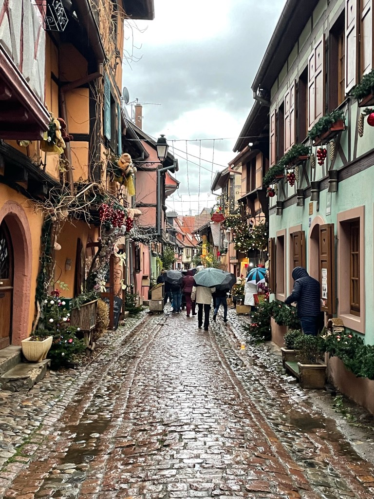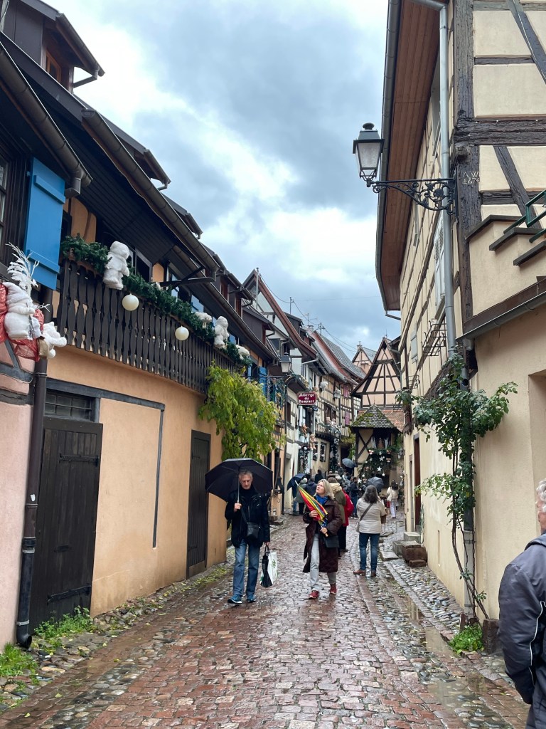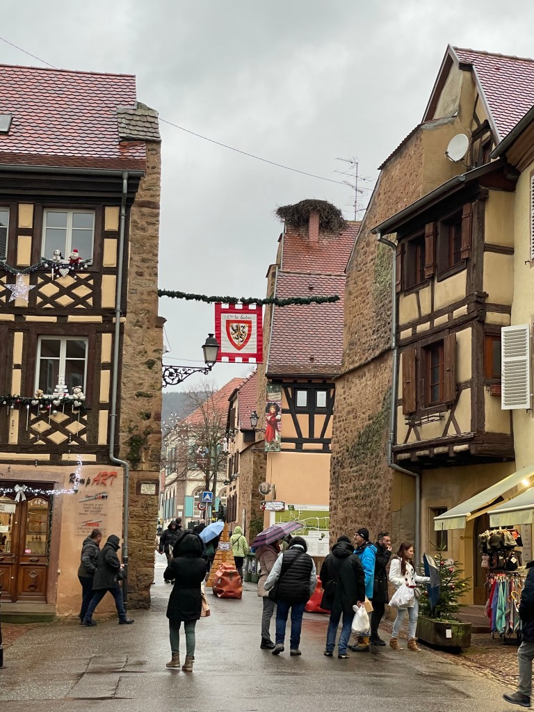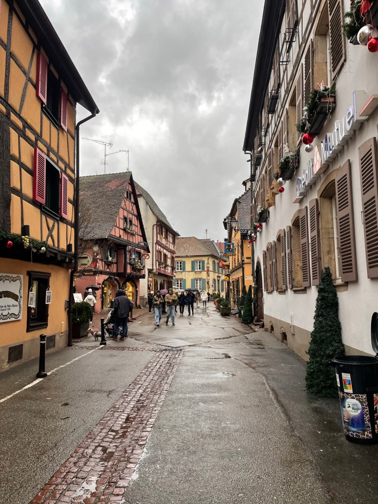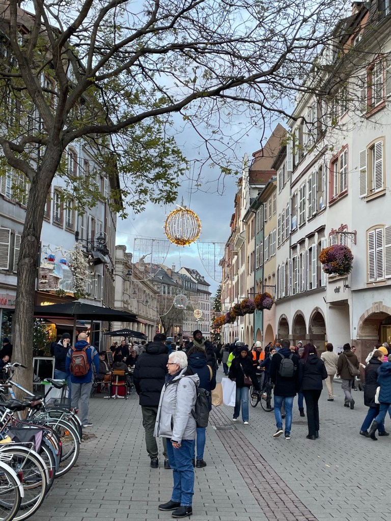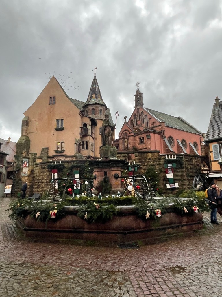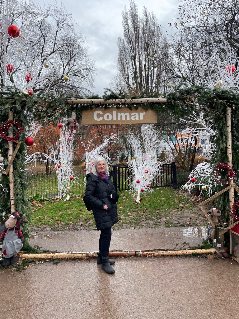 Tuesday, December 12 we took the train to Colmar, where Jim and I spent 4 days last year in late March. We had a car and were able to see a lot. This time we are using public transportation so it’s more limiting. It snowed when we were there in March, but today it’s a high of 56F and raining. Crazy! Colmar has a wonderful old town and we spent our time there, Christmas markets were scattered about and the entire area is very festive. After spending a few hours there we took a shuttle to the little town of Eguisheim, one of France’s Beautiful Villages. Of course it was decked out for the holidays and we had a nice time wandering the little streets. The storks are gone for the winter, but we did see a couple of their nests perched high on the rooftops. After taking the shuttle back to Colmar we had dinner in the covered market in the old town before taking the train back to Strasbourg. Every day for the last week we have been so much walking. I have over 20,000 steps for today and I’m tired!