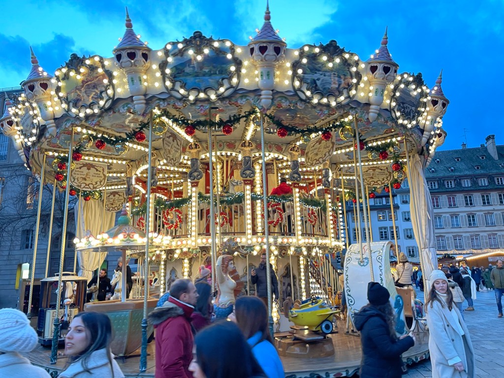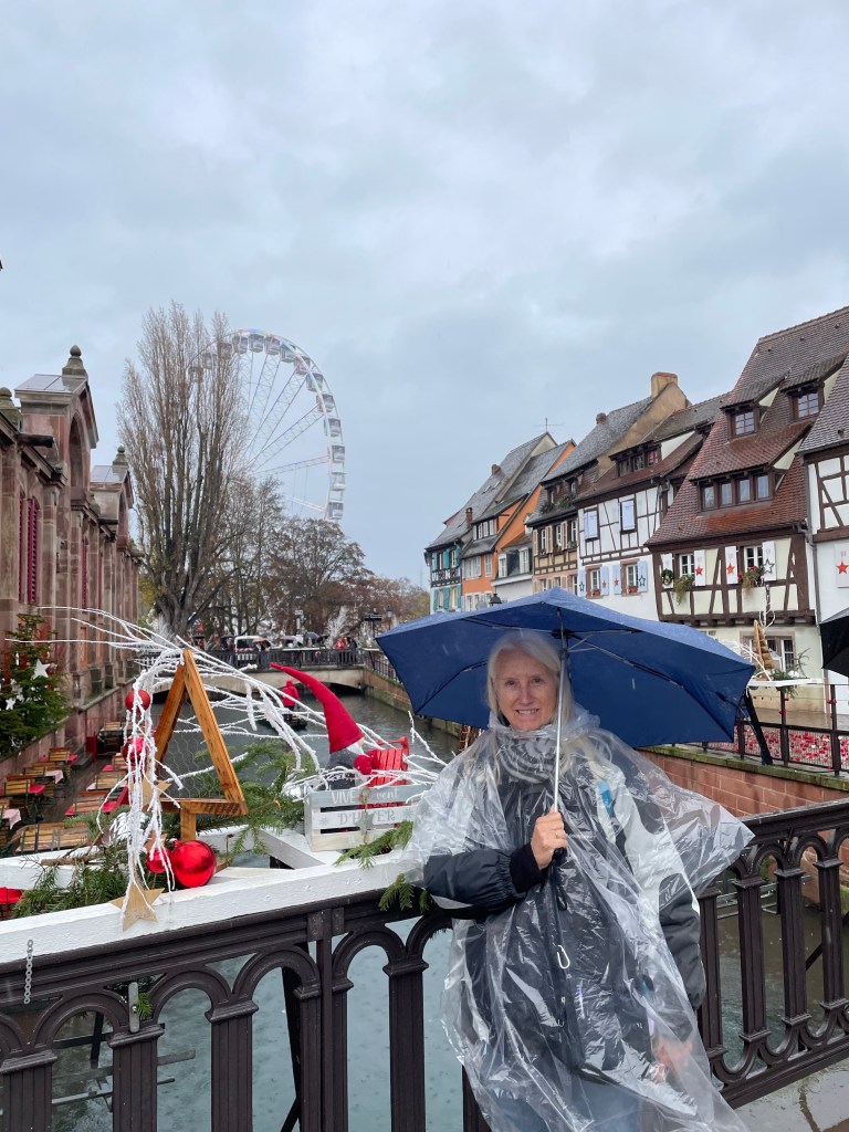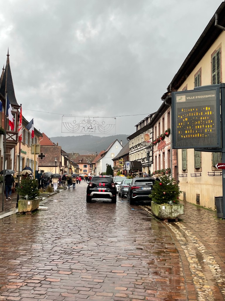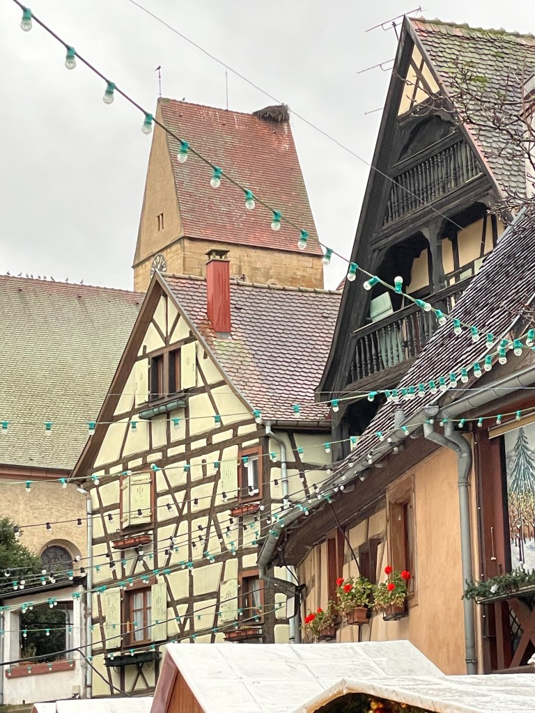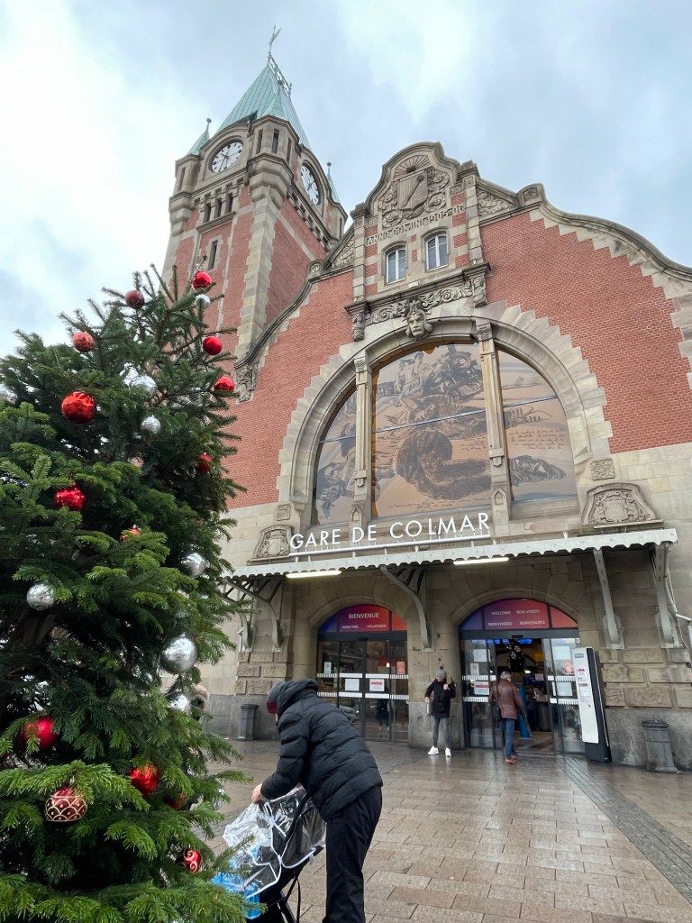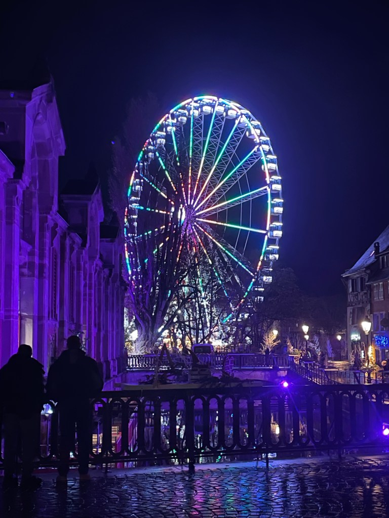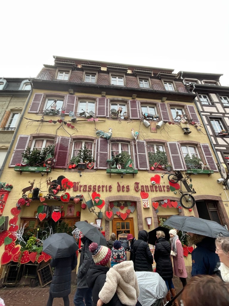 Tuesday, December 12 we took the train to Colmar, where Jim and I spent 4 days last year in late March. We had a car and were able to see a lot. This time we are using public transportation so it’s more limiting. It snowed when we were there in March, but today it’s a high of 56F and raining. Crazy! Colmar has a wonderful old town and we spent our time there, Christmas markets were scattered about and the entire area is very festive. After spending a few hours there we took a shuttle to the little town of Eguisheim, one of France’s Beautiful Villages. Of course it was decked out for the holidays and we had a nice time wandering the little streets. The storks are gone for the winter, but we did see a couple of their nests perched high on the rooftops. After taking the shuttle back to Colmar we had dinner in the covered market in the old town before taking the train back to Strasbourg. Every day for the last week we have been so much walking. I have over 20,000 steps for today and I’m tired!
