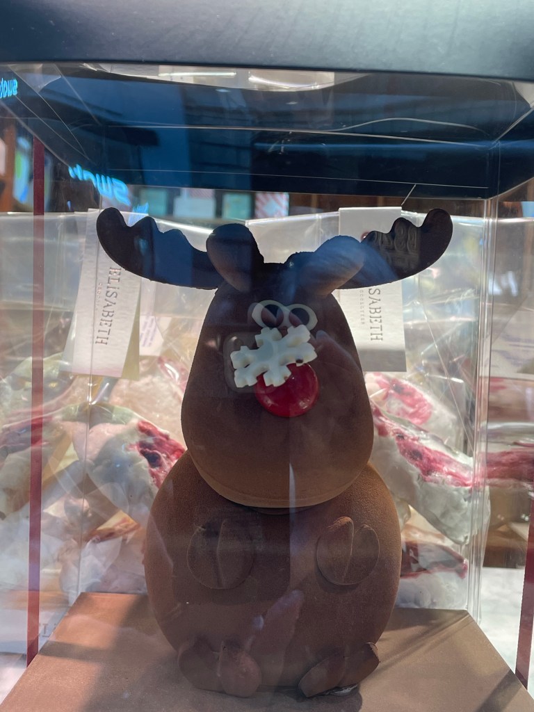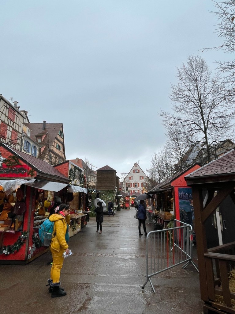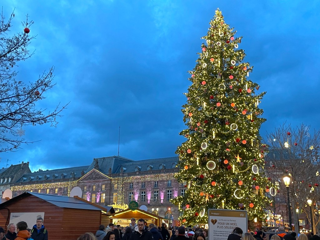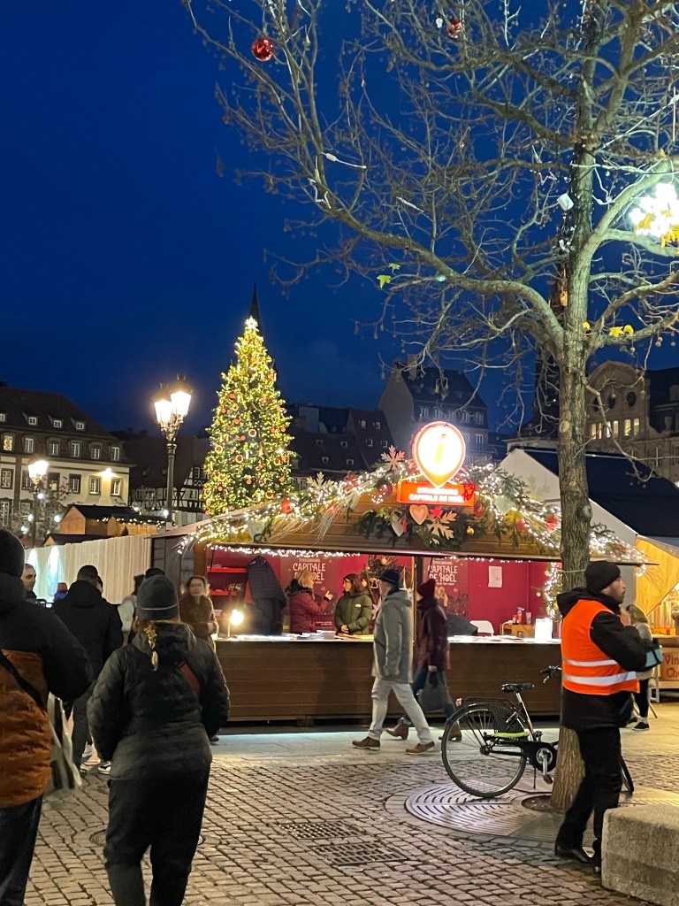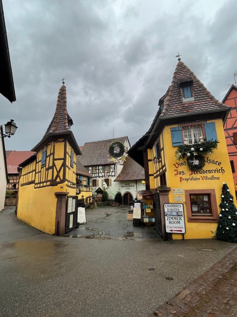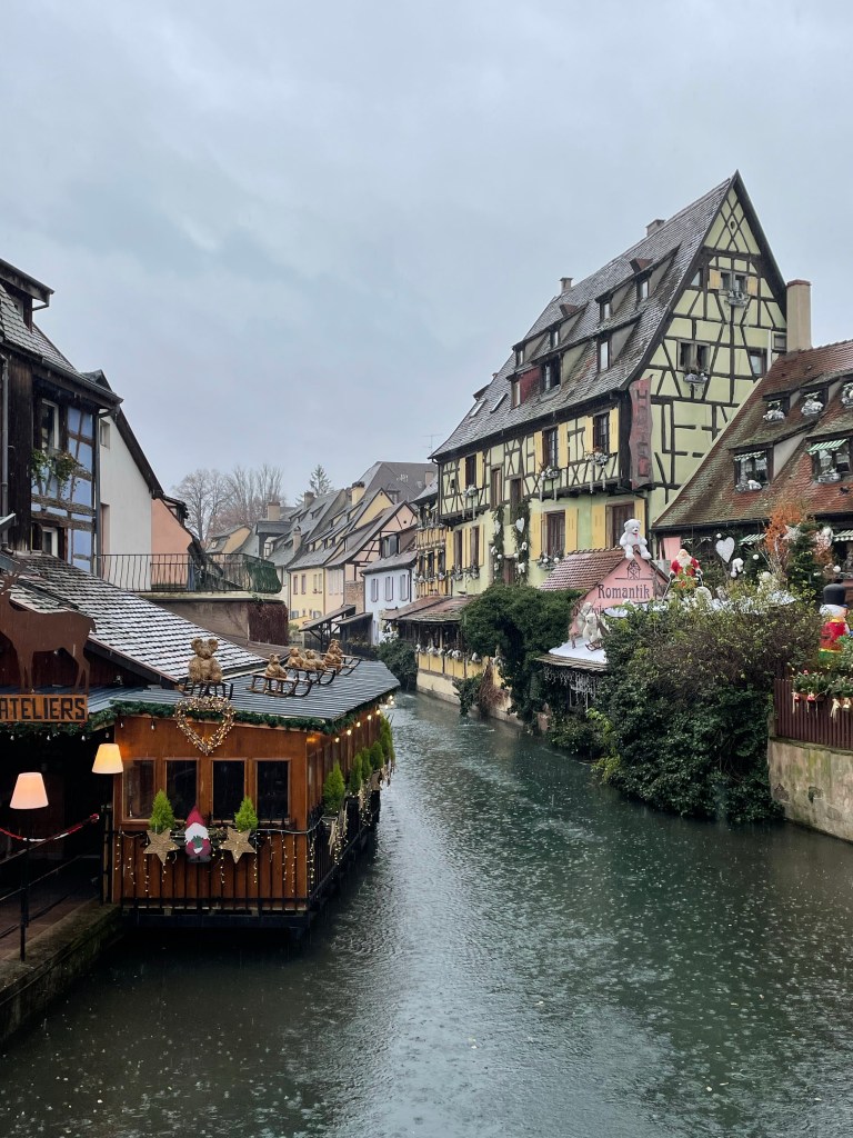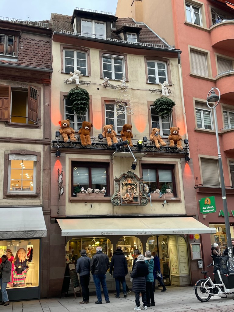 Tuesday, December 12 we took the train to Colmar, where Jim and I spent 4 days last year in late March. We had a car and were able to see a lot. This time we are using public transportation so it’s more limiting. It snowed when we were there in March, but today it’s a high of 56F and raining. Crazy! Colmar has a wonderful old town and we spent our time there, Christmas markets were scattered about and the entire area is very festive. After spending a few hours there we took a shuttle to the little town of Eguisheim, one of France’s Beautiful Villages. Of course it was decked out for the holidays and we had a nice time wandering the little streets. The storks are gone for the winter, but we did see a couple of their nests perched high on the rooftops. After taking the shuttle back to Colmar we had dinner in the covered market in the old town before taking the train back to Strasbourg. Every day for the last week we have been so much walking. I have over 20,000 steps for today and I’m tired!