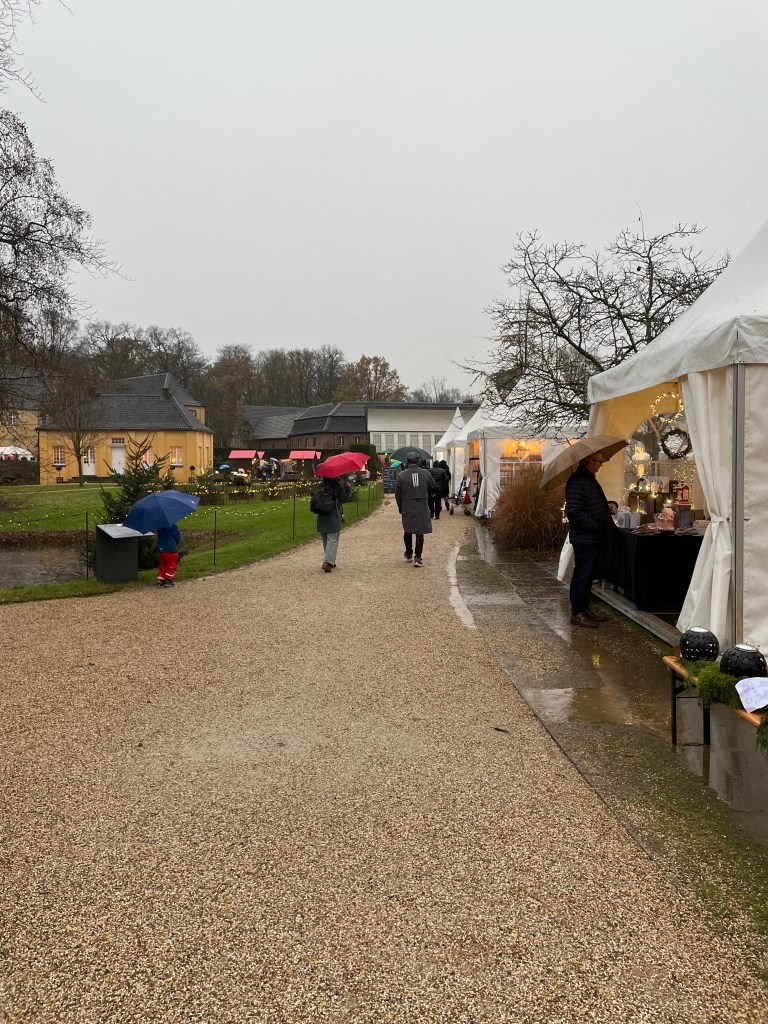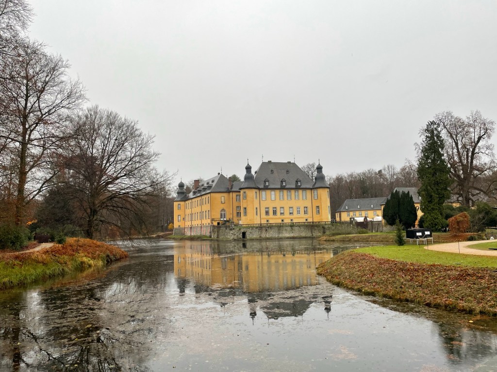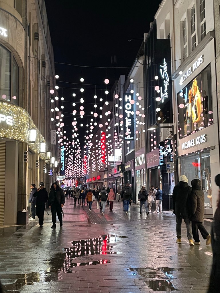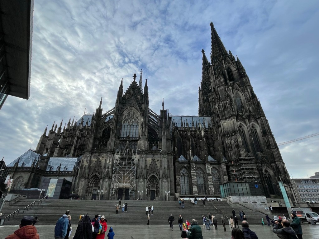 Saturday. December 9 was a long day. We showered and set out to find some breakfast. We ended up at the train station for more options and it’s only a five minute walk away. After that we went to the magnificent Dom, then walked around a huge Christmas market nearby. After a quick trip back to the hotel to grab our warmer scarves we met up with the family to take a day trip to Schloss Duck. We took a train and a taxi to get there. Actually two taxis since there were 7 of us. There was a Christmas market on the expansive grounds and it began to rain as we walked through it. It continued to rain the rest of the time we were there. When it began raining harder we decided it was time to see the inside of the castle. Unfortunately no photos were allowed inside. Everyone was getting hungry and we had to wait about 30 minutes to get a table in the restaurant there. It was worth it to not eat at the market in the rain and the food was good. When we were ready to call it a day we took a taxi back to the train station, but there wasn’t a train. Something was going on with the track. The alternative was a bus, but it never came either. A taxi, or two taxis, back to Cologne would be very expensive. Thankfully a different train option eventually came up and we made it back to Cologne around 11:00 p.m. it was a long, wet, but mostly enjoyable day.