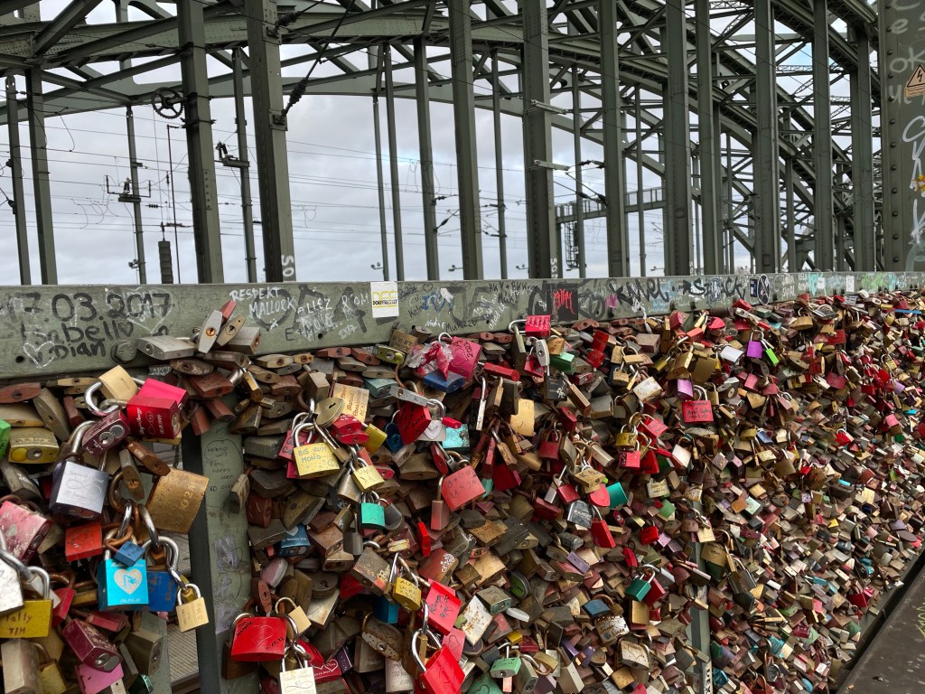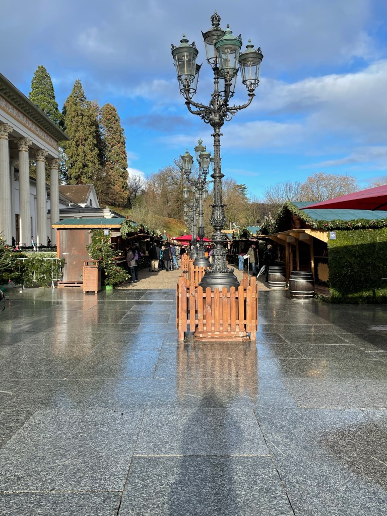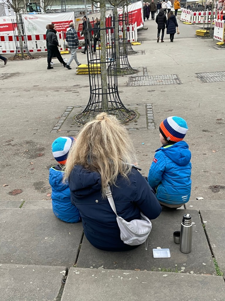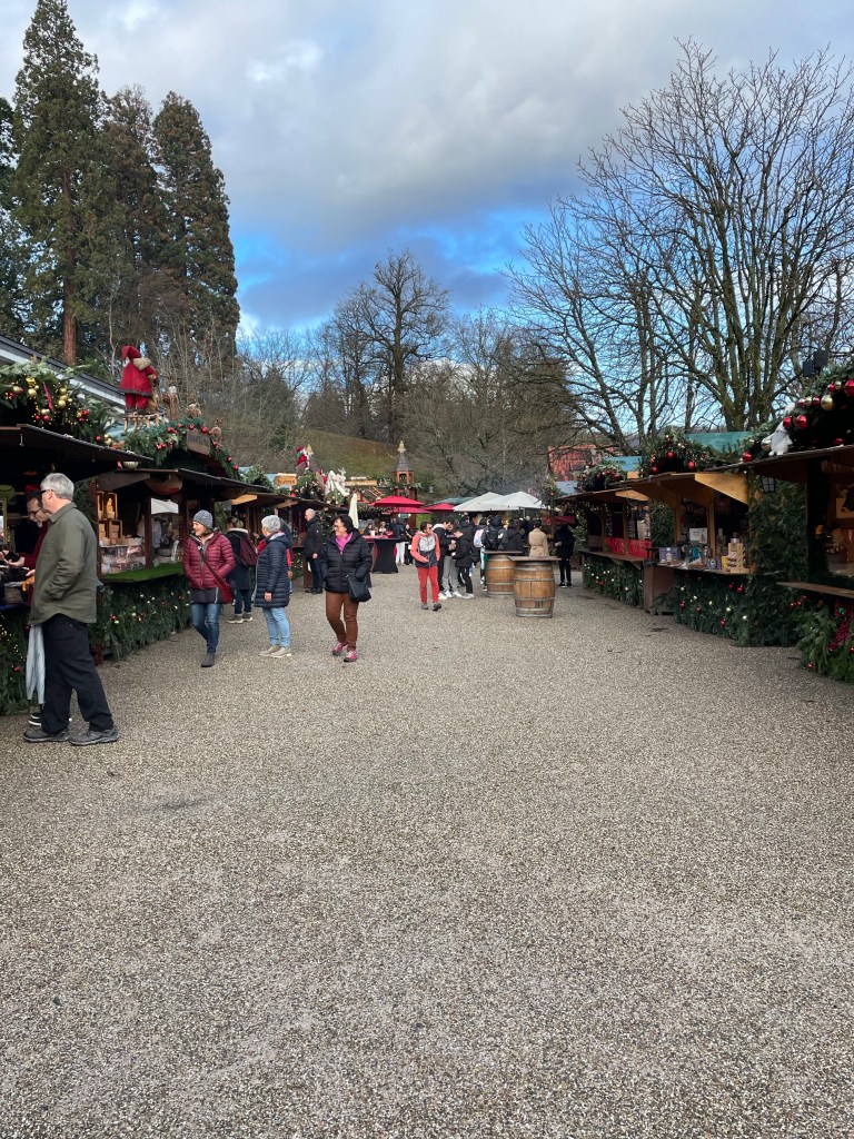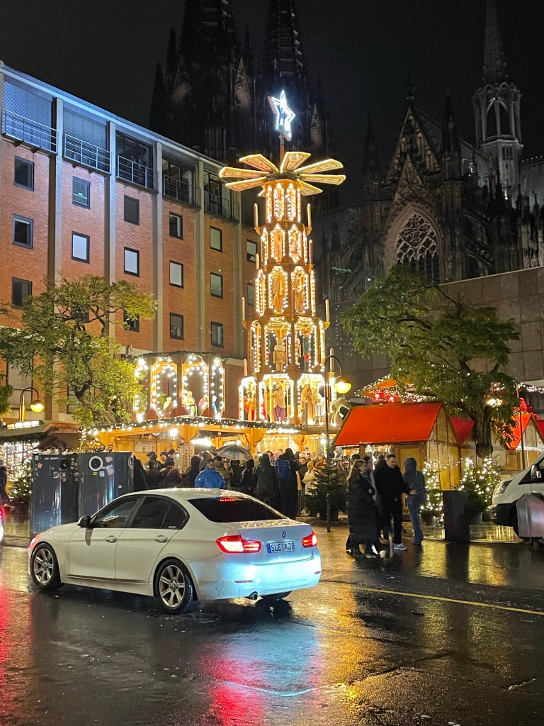 Saturday. December 9 was a long day. We showered and set out to find some breakfast. We ended up at the train station for more options and it’s only a five minute walk away. After that we went to the magnificent Dom, then walked around a huge Christmas market nearby. After a quick trip back to the hotel to grab our warmer scarves we met up with the family to take a day trip to Schloss Duck. We took a train and a taxi to get there. Actually two taxis since there were 7 of us. There was a Christmas market on the expansive grounds and it began to rain as we walked through it. It continued to rain the rest of the time we were there. When it began raining harder we decided it was time to see the inside of the castle. Unfortunately no photos were allowed inside. Everyone was getting hungry and we had to wait about 30 minutes to get a table in the restaurant there. It was worth it to not eat at the market in the rain and the food was good. When we were ready to call it a day we took a taxi back to the train station, but there wasn’t a train. Something was going on with the track. The alternative was a bus, but it never came either. A taxi, or two taxis, back to Cologne would be very expensive. Thankfully a different train option eventually came up and we made it back to Cologne around 11:00 p.m. it was a long, wet, but mostly enjoyable day.