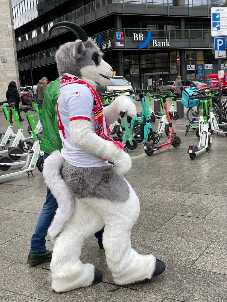 The Köln FC mascot walking in front of the train station