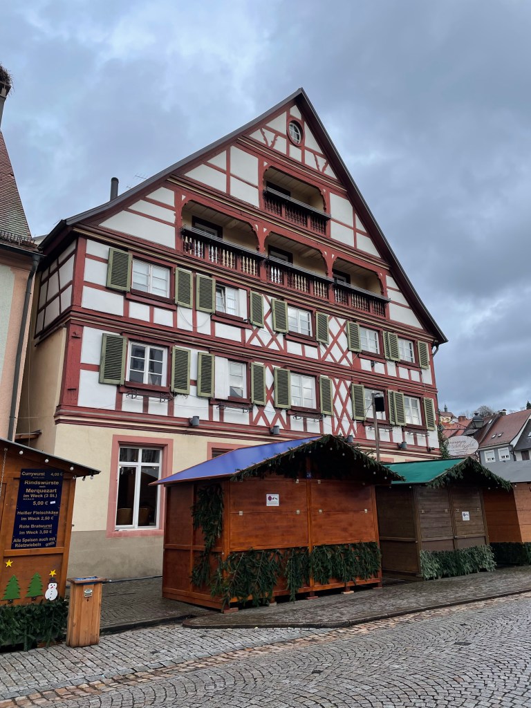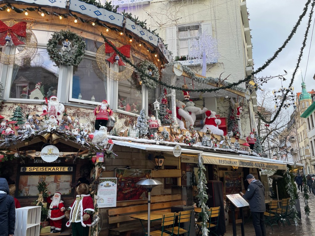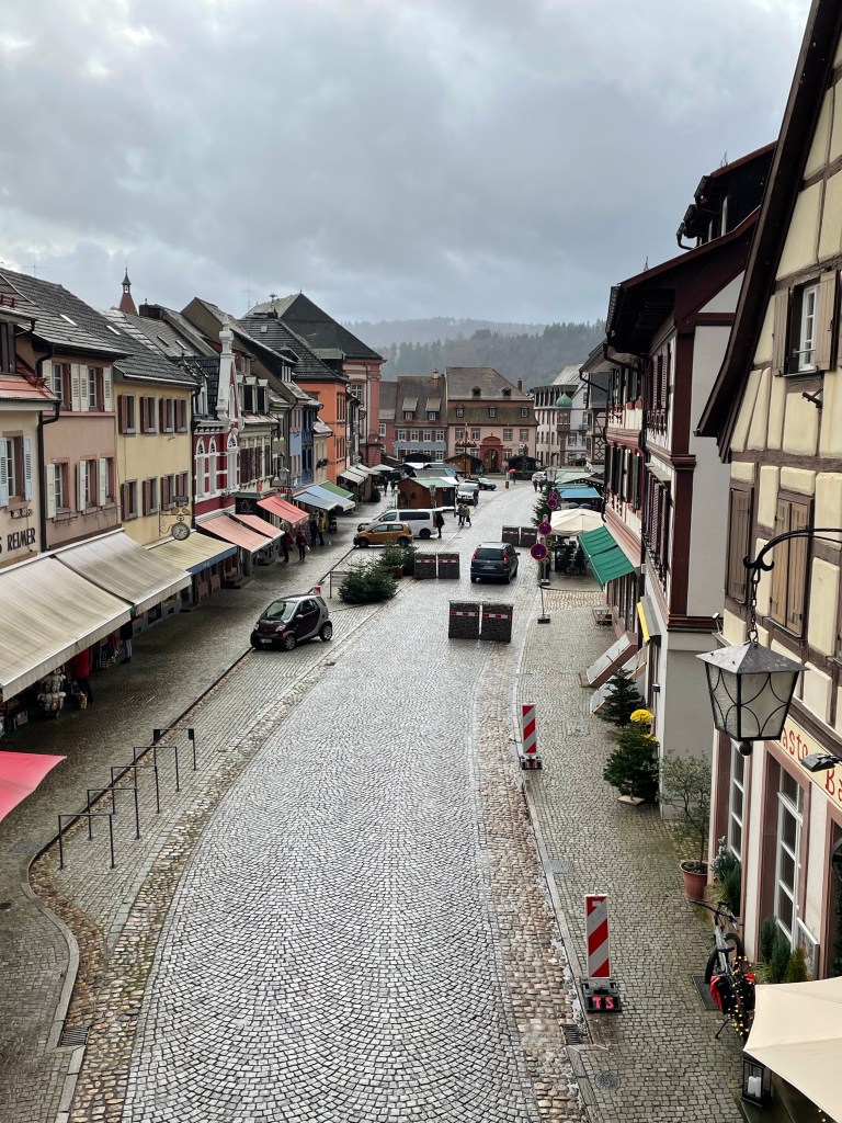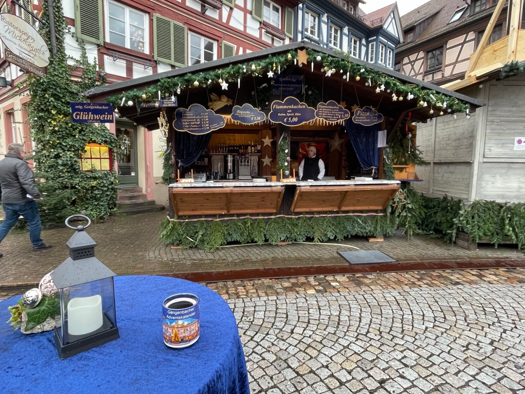 Wednesday, December 13 What to do today? A trip to Basel, Switzerland? It’s not too far away. Wait, we can travel anywhere in Germany for free without tickets on the regional and local trains, plus any other public transportation with the D-Tickets were have. Hey, why not go to Baden Baden, in the Black Forest? We took a tram from Strasbourg to Kehl, which is a few miles away and just over the border. From there we took the train. First we went to the famous Baden Baden casino, but it was too early to get past the lobby area. We walked into the old town and checked out what was there. Then I remembered that Gengenbach, a small town i had heard good things about in the Black Forest wasn’t too far away. We wandered through the big Baden Baden Christmas market on our way back to the bus that would take us to the train station. We really liked Gengenbach. We admired the buildings and when it was 5:00 somewhere we had some Glühwein. Right by where we were standing to drink our wine there was a little stand that sold roasted chestnuts. I had been telling Marie that she needed to try them, so why not now? I bought a small packet and it was more than enough to share. When it was time to head back to Strasbourg is when the real adventure began. We had to change trains and I knew the name of the station and how long it would take to get there. At the stop I could see the station name so we got off. Turns out it was a big mistake. There are two stations with that name, but where we got out had an additional name after it. We had to wait quite a while until another train came along that would take us to the next station. When I say we got off at a station, it’s not really a station. No building or indoor space at all, so we were outside on the platform. Luckily there was a bus stop type overhang and a few seats, since it had been raining off and on throughout the day and it started up again. We finally made it back to Strasbourg and the plan was to go to the Christmas market with the good food and get some dinner. But…it was raining and there’s no covered place to eat. We ended up picking sandwiches up at the train station and to them back to our apartment to eat them. We called it a day and are looking forward to our last day in Strasbourg and France. Traveling doesn’t always go as planned, but it always works out.