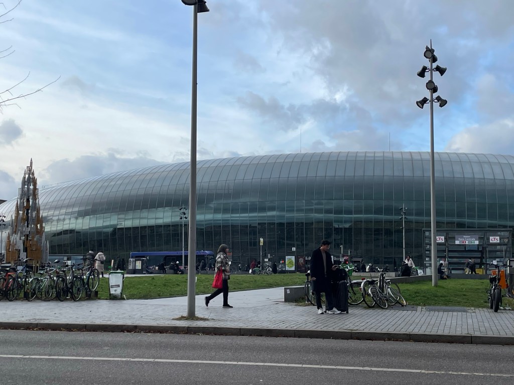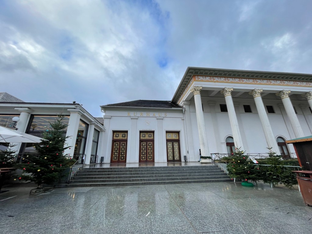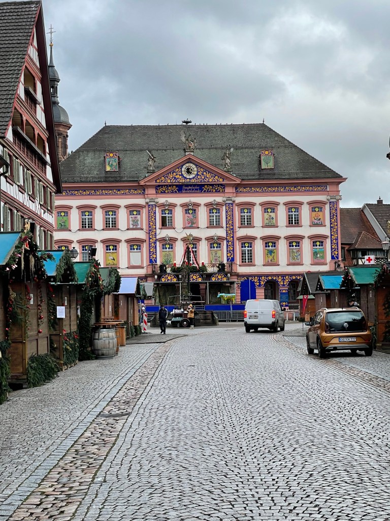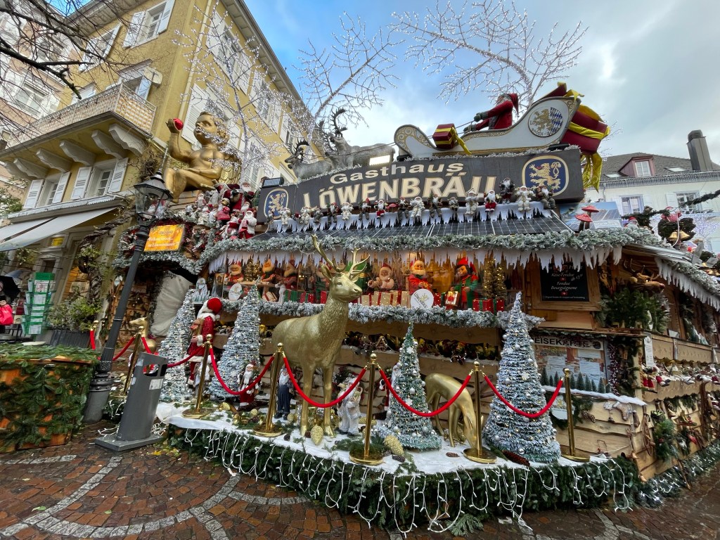 Wednesday, December 13 What to do today? A trip to Basel, Switzerland? It’s not too far away. Wait, we can travel anywhere in Germany for free without tickets on the regional and local trains, plus any other public transportation with the D-Tickets were have. Hey, why not go to Baden Baden, in the Black Forest? We took a tram from Strasbourg to Kehl, which is a few miles away and just over the border. From there we took the train. First we went to the famous Baden Baden casino, but it was too early to get past the lobby area. We walked into the old town and checked out what was there. Then I remembered that Gengenbach, a small town i had heard good things about in the Black Forest wasn’t too far away. We wandered through the big Baden Baden Christmas market on our way back to the bus that would take us to the train station. We really liked Gengenbach. We admired the buildings and when it was 5:00 somewhere we had some Glühwein. Right by where we were standing to drink our wine there was a little stand that sold roasted chestnuts. I had been telling Marie that she needed to try them, so why not now? I bought a small packet and it was more than enough to share. When it was time to head back to Strasbourg is when the real adventure began. We had to change trains and I knew the name of the station and how long it would take to get there. At the stop I could see the station name so we got off. Turns out it was a big mistake. There are two stations with that name, but where we got out had an additional name after it. We had to wait quite a while until another train came along that would take us to the next station. When I say we got off at a station, it’s not really a station. No building or indoor space at all, so we were outside on the platform. Luckily there was a bus stop type overhang and a few seats, since it had been raining off and on throughout the day and it started up again. We finally made it back to Strasbourg and the plan was to go to the Christmas market with the good food and get some dinner. But…it was raining and there’s no covered place to eat. We ended up picking sandwiches up at the train station and to them back to our apartment to eat them. We called it a day and are looking forward to our last day in Strasbourg and France. Traveling doesn’t always go as planned, but it always works out.