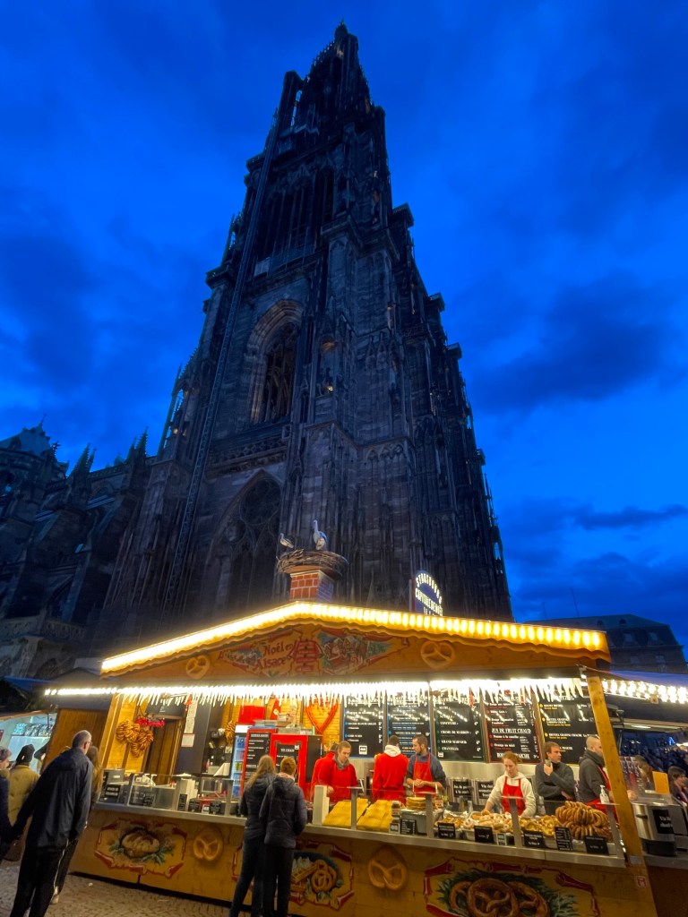 Monday, December 11 we took the train to Strasbourg, France. We will spend the next 4 nights here and do some day trips in the region. After arriving around noon we settled into our studio apartment, did a load of laundry and picked up a few provisions at the store. You know, all the fun stuff. Then it was time to see some of Strasbourg. I was here last year so I figured we should head towards the Cathédrale Notre-Dame de Strasbourg. We came upon a Christmas market so we checked it out. It seemed like a good time to have some Vin Chaud, as they call Glühwein in France. It was delicious and we both preferred it to what we had in Belgium and Germany, so far anyway. We will be giving Germany more time to win us over when we return there later this week. Strasbourg is wonderfully festive. They call themselves the Christmas Capital, and I can’t say they are wrong. Walked through a couple more markets We ended up getting dinner at one them. It was very tasty.