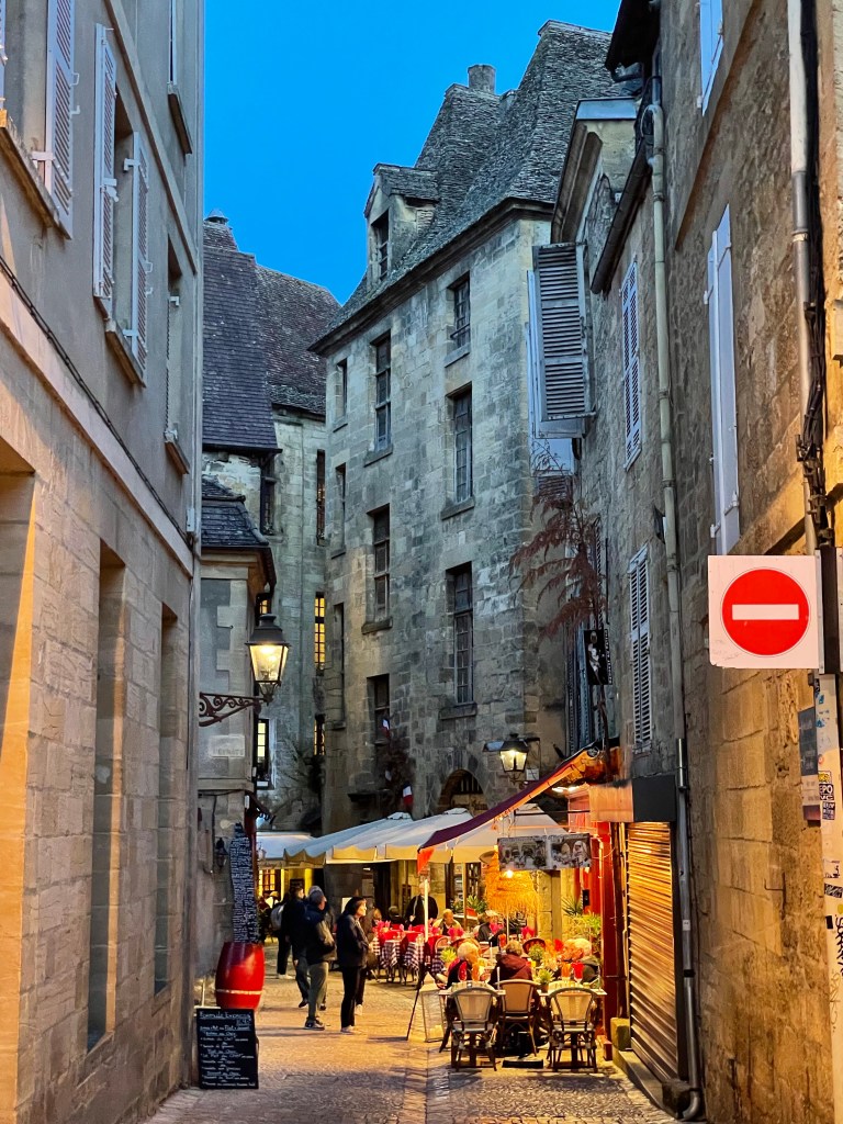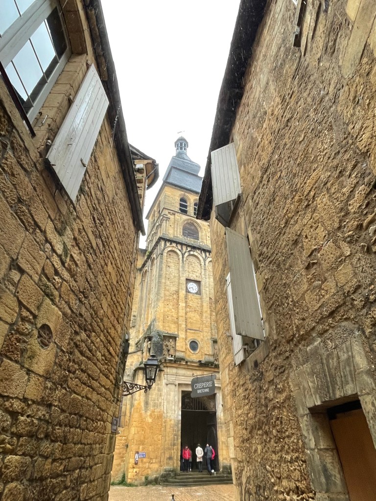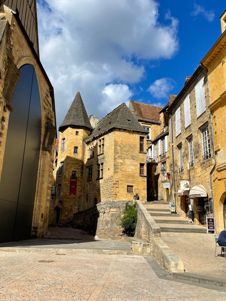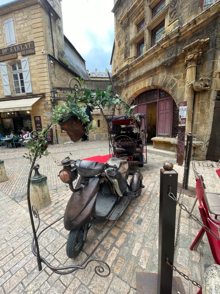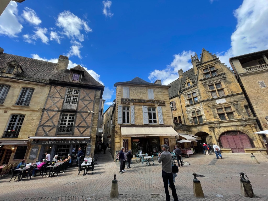 Friday, September 30 we woke up at our hotel near the airport, had breakfast and took a taxi back to the airport. Those 2 taxi rides ended up costing us $45. That was for 2 miles each way. What a rip off. After a mechanical situation with the first car we finally got on the road. After SUV’s for 4 people with automatic transmissions in Ireland and Scotland we now had 4 door Fiat 500 with a manual transmission. Very different, but the car is fine. We got a later start than we had hoped for so had to bypass a stop I was wanting to make on the way to a cute little town. We will see a lot of cute towns, so not a big deal. We got to Sarlat a couple of hours before we were to meet our Airbnb host at our apartment. We took advantage of the time by walking around the old town, and we shared a snack. We met the host and then headed for the grocery store to buy supplies for the next 5 nights. After taking our purchases and luggage up the the apartment we went back into the old town which is less than a 5 minute walk. We walked around so more and then had dinner. We both love this town. There’s some new and interesting around every corner. We’re going to like it here.