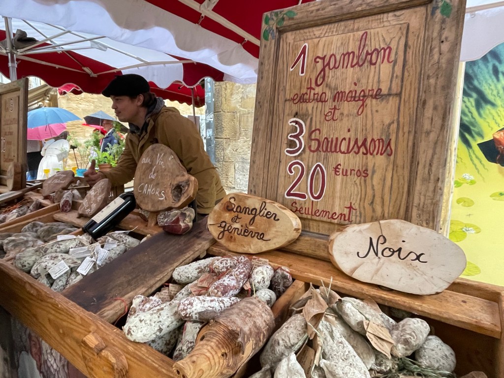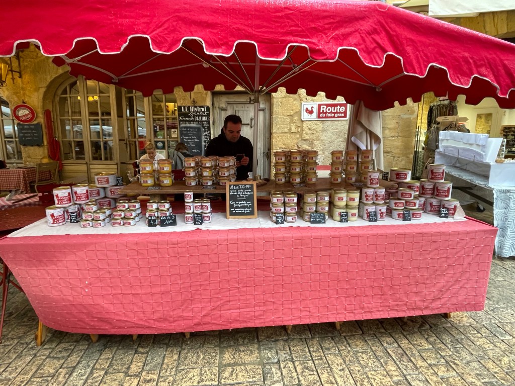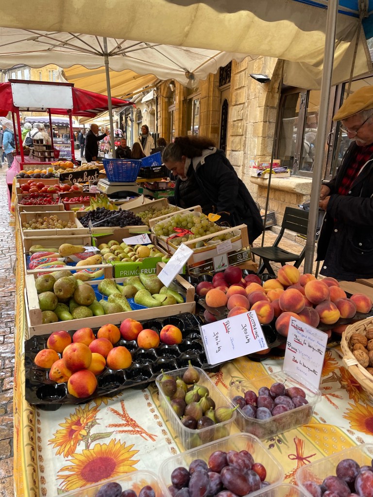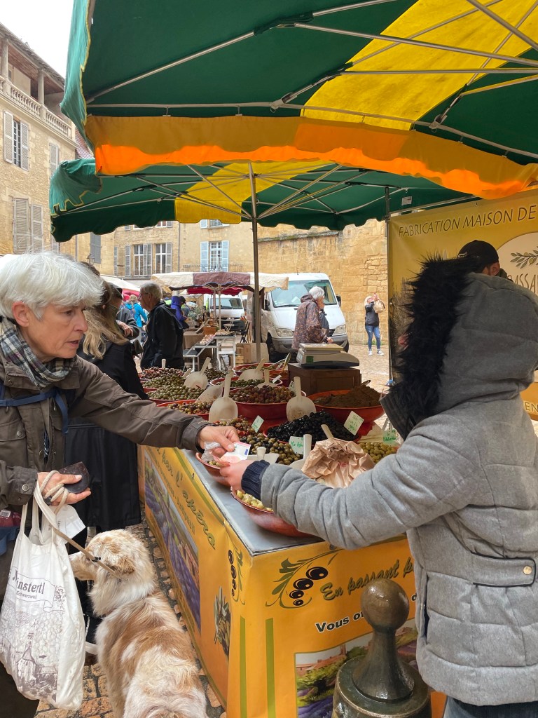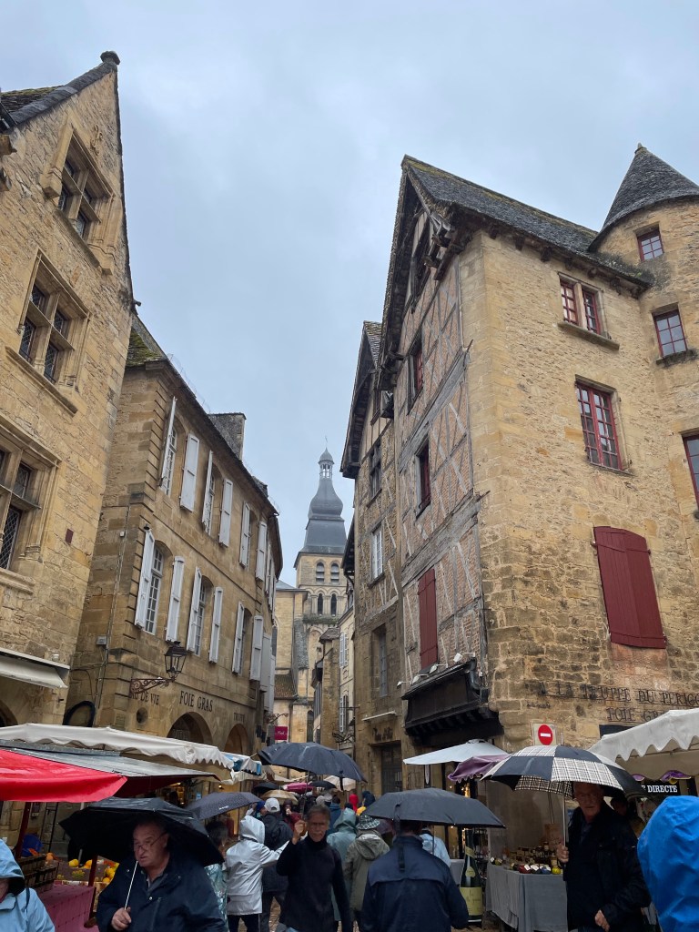Saturday, October 1 and it’s market day in Sarlat. It’s a rainy day, which is a bit disappointing. Rain or shine we are going. The market is a few minutes walk away in the old town and I enjoyed walking the different streets to see what what people were selling. We didn’t buy anything except for bread for dinner and some strawberries, but for me the markets are always about the ambience. I’m sure we will see more while we are in France.