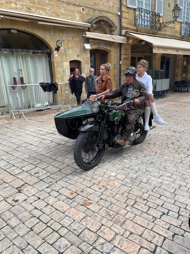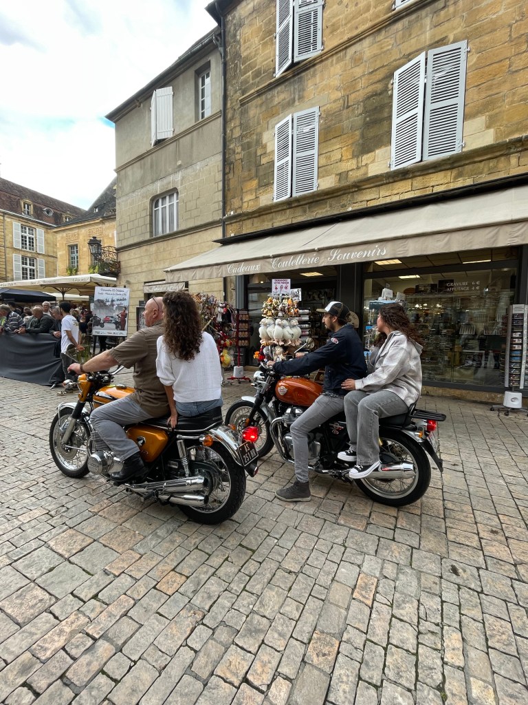 We went back to Sarlat, parked the car at our apartment and walked into the old town. Sarlat was busy! There was a car show that Jim wanted to see and as we walked down the street we saw some great vintage cars. We walked to another street because we saw cars there, and at the end of the street a crowd was gathered and we saw a red carpet and a stage, or as we were soon to find out, it was a runway. A fashion show? It was unexpected, except when I looked at the flyer we had picked up and translated it I found it was very clear. Many of the cars/motorcycles were just a way to deliver the models to the stage. The models were every age from very young children to mature adults, both male and female. The clothing went from lingerie to outerwear, and everything in between.